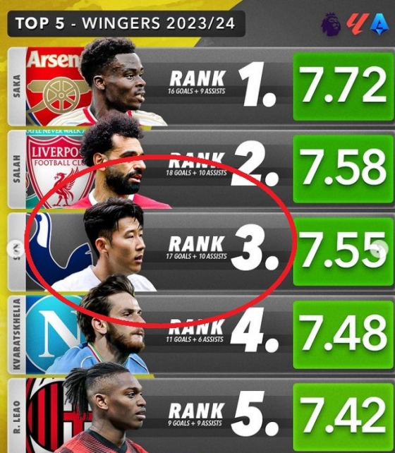 올 시즌 뛰어난 활약을 펼친 손흥민이 3위에 이름을 올렸다. 1위는 부카요 사카(아스널), 2위 모하메드 살라(리버풀), 4위 흐비차 크바라츠헬리아(나폴리), 5위 하파엘 레앙(AC밀란)이다. 빅리그 선수를 대상으로 한만큼 세계 최고 윙어 3위라고 해도 무방하다.