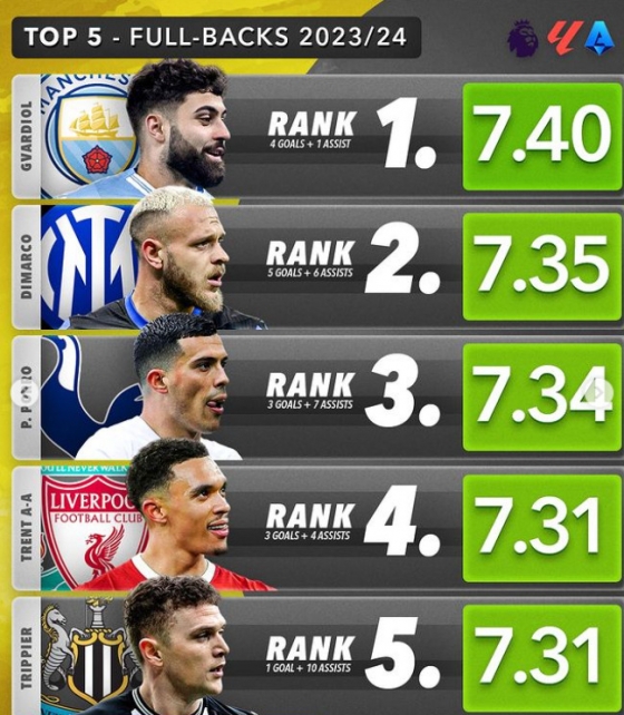 한편 '스코어90'은 윙어 부문뿐 아니라 '세계 3대 빅리그 풀백 베스트5'도 선정했는데 손흥민의 토트넘 동료 페드로 포로가 3위로 뽑혀 눈길을 끌었다. 1위는 요슈코 그바르디올(맨체스터 시티), 2위 페데리코 디마르코(인터밀란), 4위 트렌트 알렉산더-아놀드(리버풀), 5위 키어런 트리피어(뉴캐슬)다.