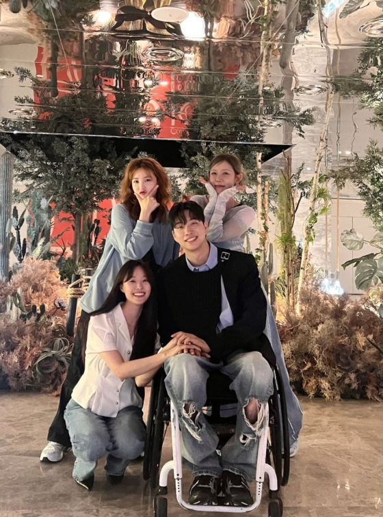 송지은은 박위 옆에서 환한 웃음을 짓고 있고, 전효성과 정하나는 두 사람 뒤에 서서 귀여운 포즈를 취하고 있었다.