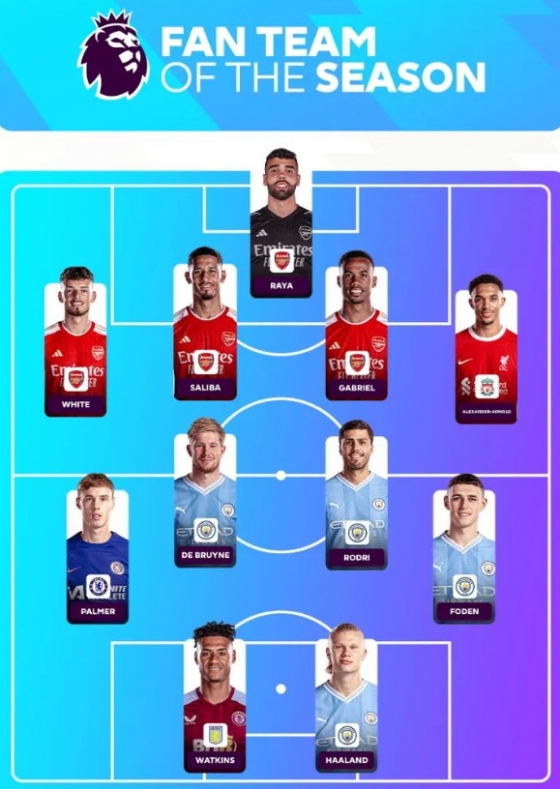 EPL 사무국은 29일 공식 채널을 통해 '2023~24시즌 잉글리시 프리미어리그(EPL) 올해의 팀(베스트 11)'을 발표했다. 투표는 지난 21일부터 27일까지 팬 투표로 이뤄졌다.