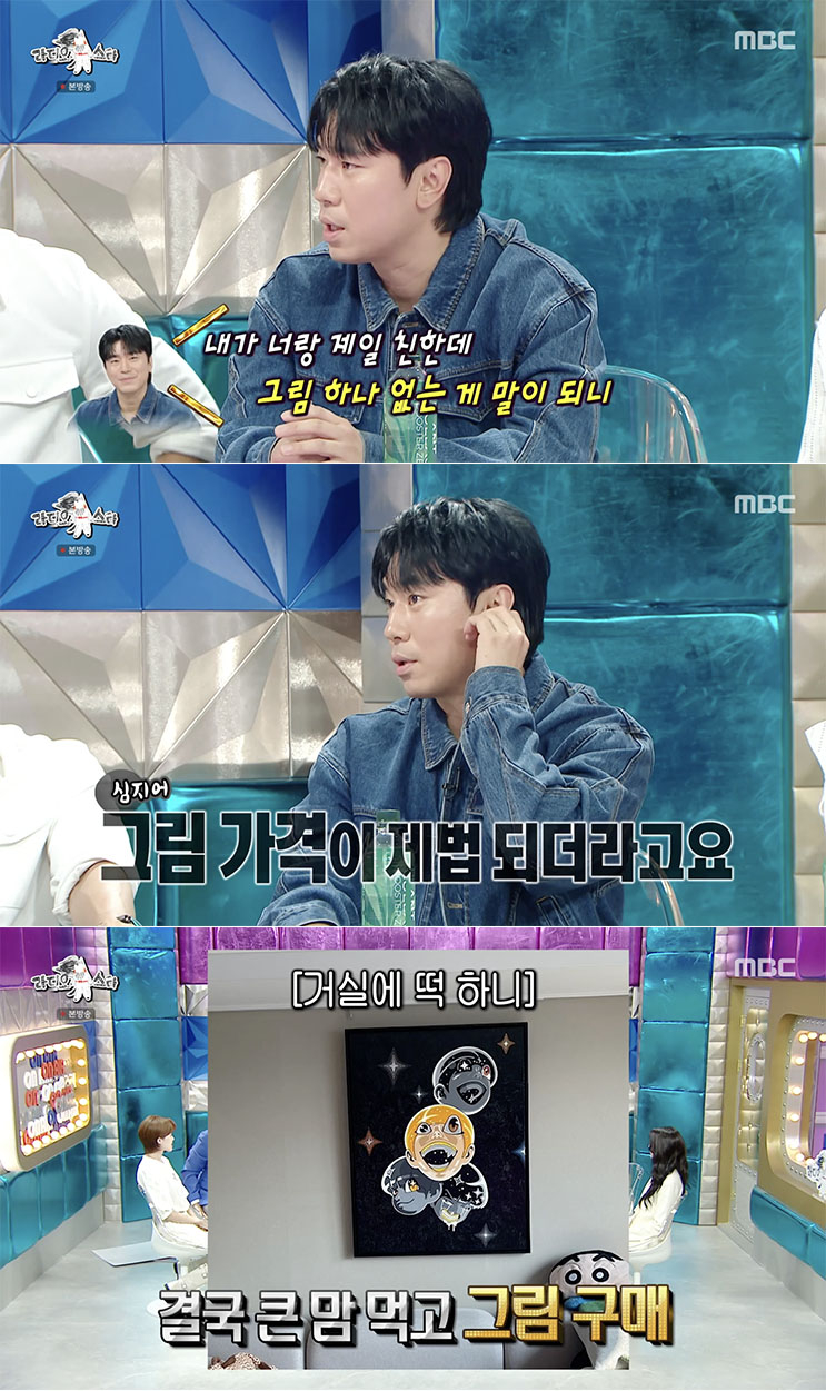 그는 기안84와 가장 친한데 그의 그림이 하나도 없는 게 말이 되나 싶어 기안84에게 작품 구매 의사가 있다고 전했다 밝혔다. 그러면서 "그런데 사실 살 마음으로 얘기한 건 아니고 없으니까 던진 멘트였다"라고 덧붙였다. 기안84는 3-4년 뒤에 그림을 그려줄 수 있을 것 같다고 답했다고 털어놨다.