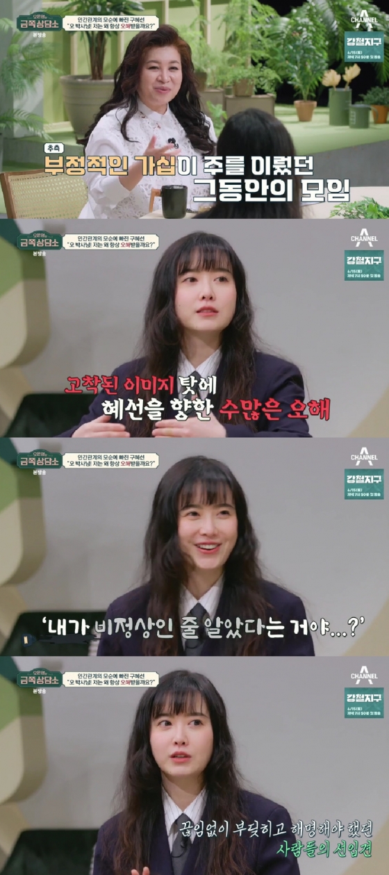 이에 구혜선은 "배우로 살 때 많이 공격받아 다른 일을 추구한다는 생각이 든 적도 있었다. 열심히 노력했지만 의도치 않은 오해를 받게 되었고, 배우 구혜선은 교화가 어려운 느낌이지만 감독 구혜선은 나이스한 사람으로 다가간 것 같았다"라고 솔직하게 전했다. 이에 오은영은 "여전히 데뷔 초 기준을 가지고 있는 것 같다. 20년 동안 자신을 증명하는 것에 몰두하는 것 같아서 안쓰럽다"고 말했다.