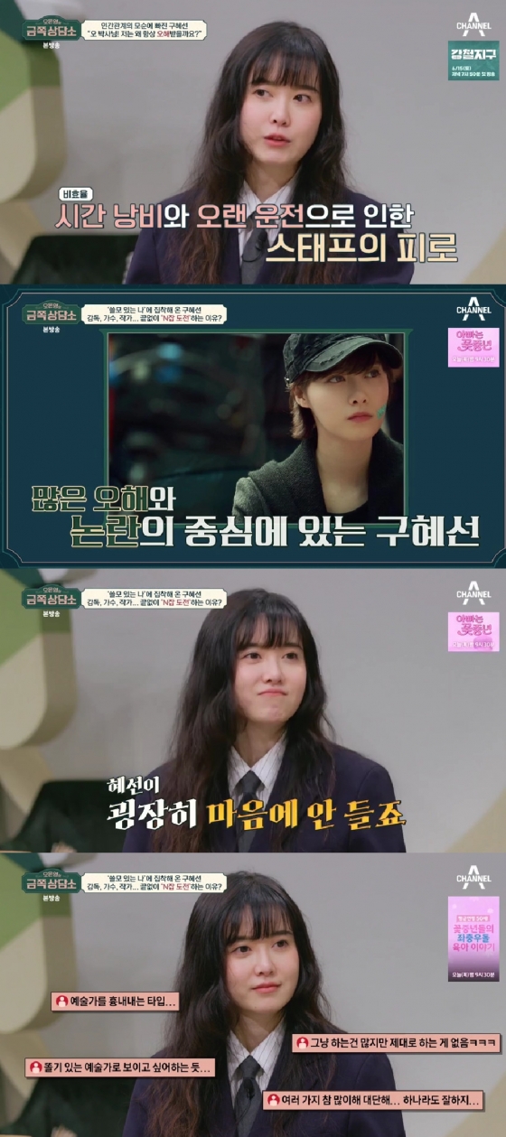 구혜선은 "오해받는 경우도 많다. 시트콤 '논스톱5'에 출연해서 엉뚱한 캐릭터를 연기했다. 대중의 인식에 엉뚱한 이미지로 인식됐다. 그게 전부가 아닌데 오해하는 단계까지 넘어가는 상황에 부닥쳐지기도 했다. 지인이 '알고 보니 정상이네'라는 말도 들었는데, 그것도 충격이었다. 사람들의 선입견을 해명하다 보니까 인간관계의 허들이 높아졌다"고 말했다.