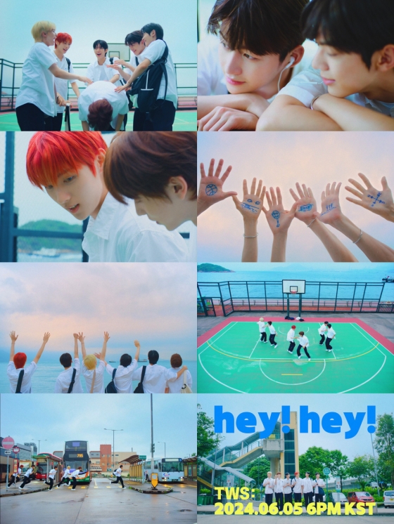 'hey! hey!' 뮤직비디오 티저는 여름방학을 알리는 듯한 학교 종소리가 울리며 시작, 질주감 넘치는 록(Rock) 기반의 강렬한 기타와 가슴 벅찬 드럼 사운드가 이어졌다. TWS 멤버들은 해맑게 웃으며 내달리는 모습으로 눈길을 사로잡았다.