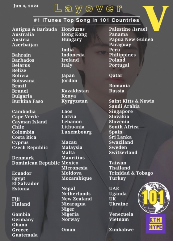 뷔의 첫 솔로 앨범 '레이오버'는 6월 4일(한국 시각) 아제르바이젠 아이튠즈 톱 앨범 차트에서 1위를 기록했다. 이로써 '레이오버'는 발매 후 아이튠즈 앨범 차트 101개국 1위를 달성하는 기록을 달성했다.