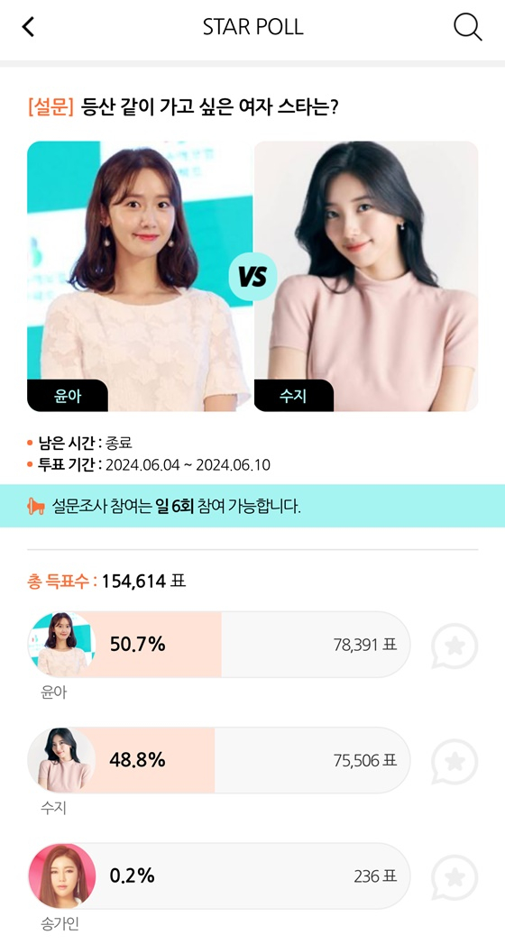 윤아는 지난 4일부터 10일까지 종합 엔터테인먼트 모바일 앱 스타폴(STARPOLL)에서 진행된 '등산 같이 가고 싶은 여자 스타는?' 설문에서 1위를 차지했다.