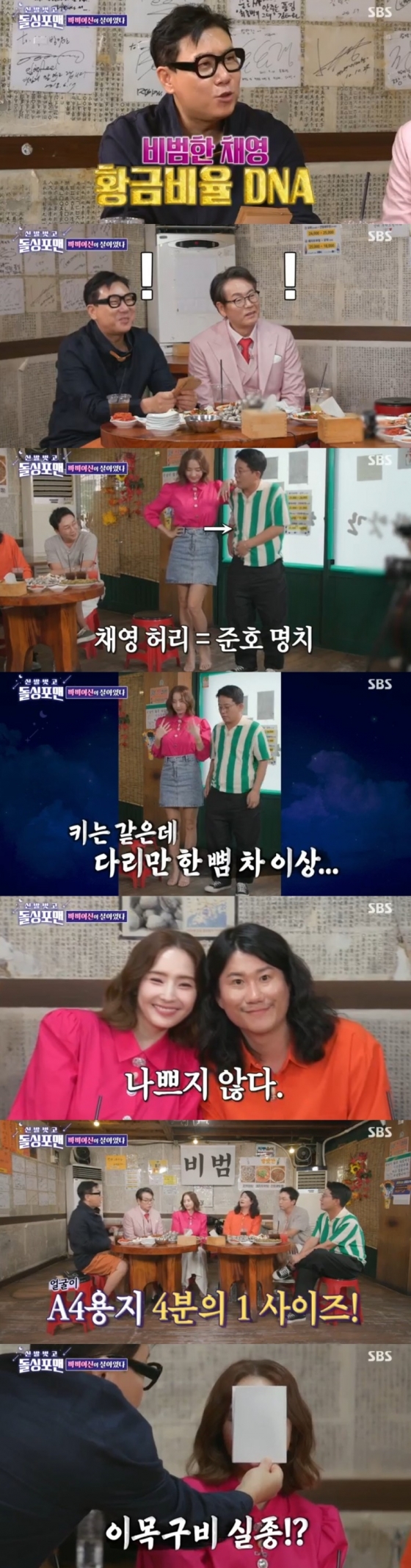 이에 김준호는 "길고 짧은 건 대봐야 안다"라며 한채영의 옆자리에 섰다가 굴욕을 맛봤다. 한 채영의 허리가 김준호의 명치에 왔던 것. 키는 같은데 다른 비율을 확인한 김준호는 "부모님도 키가 크냐"고 물었고, 이에 대해 한 채영은 "엄마가 나보다 키가 크다"라고 말했다.