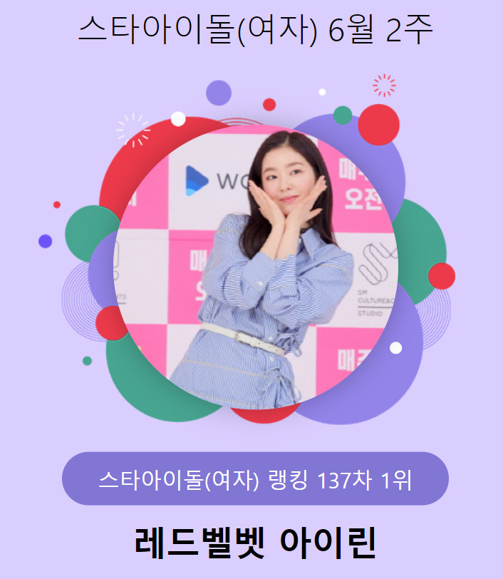 아이린은 지난 6월 6일 오후 3시 1분부터 6월 13일 오후 3시까지 진행된 6월 2주(137차) 스타랭킹 스타아이돌 여자 랭킹 투표에서 6만528표를 얻고 1위를 기록했다.