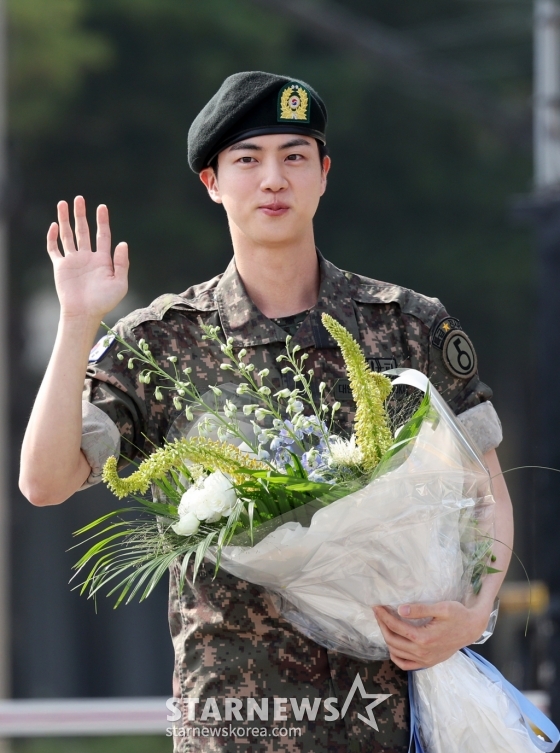 앞서 진은 지난 12일 전역 당시 부대원들과 포옹을 하며 뜨거운 눈물을 흘린 바 있다. 이와 관련해 그는 "전역할 때 안 울기로 약속했는데 그 친구들이 울어서 나도 전역할 때 슬퍼서 울었다. 분명히 나 전역할 때 내 다리 붙잡고 오열한다는 친구가 있었는데 안 했더라. 서운하다"라고 너스레를 떨었다.