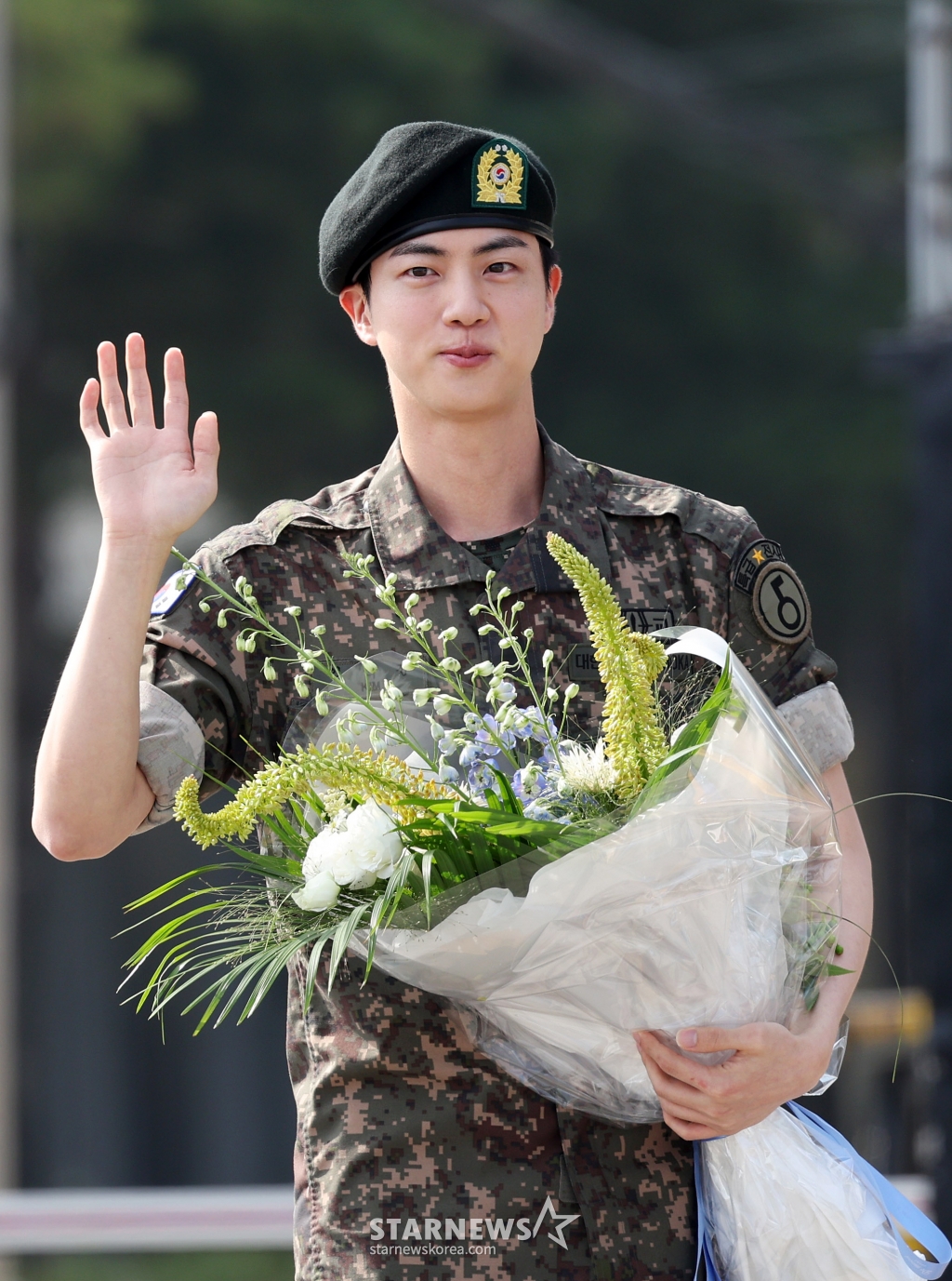 진은 지난 12일 경기도 연천군에 위치한 제5보병사단에서 육군 병장 만기 전역했다. 그룹 내 첫 군필자의 탄생을 축하하기 위해 방탄소년단 멤버들도 진 전역식을 찾았다. 현재 사회복무요원으로 대체 복무 중인 슈가를 제외한 RM, 제이홉, 지민, 뷔, 정국은 이날 제5보병사단을 찾아 진의 전역을 축하했다.