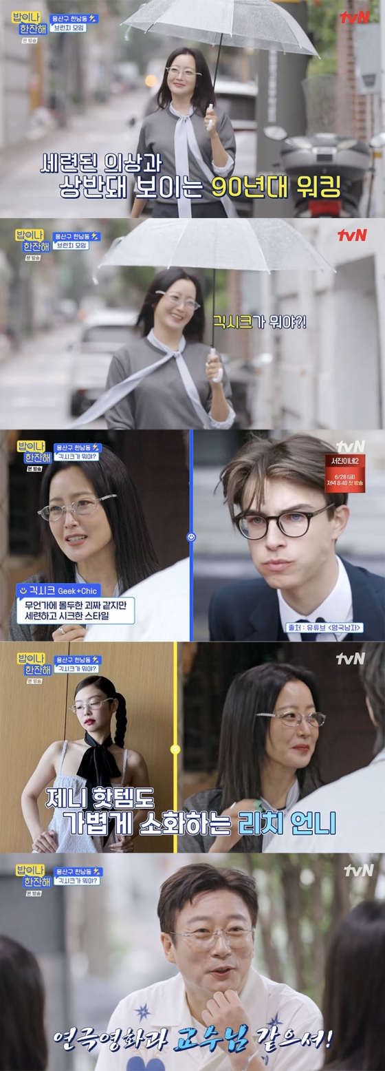 13일 방송된 tvN '밥이나 한잔해' 4회에서는 김희선이 '긱시크' 드레스 코드에 맞춰 블랙핑크 제니의 안경을 완벽하게 소화한 장면이 그려졌다.