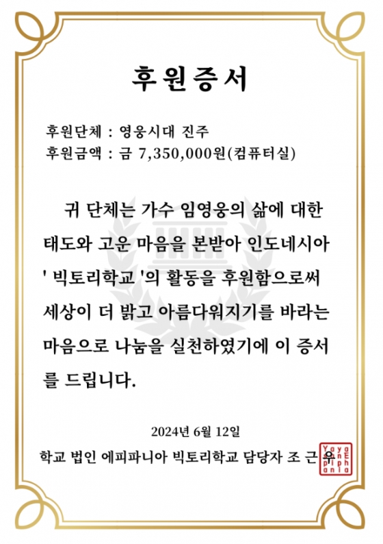 임영웅 팬클럽 '진주 영웅시대'는 임영웅의 생일(6월 16일)을 맞아 지난 12일 학교법인 에피파니아 빅토리학교에 735만 원을 기부했다.