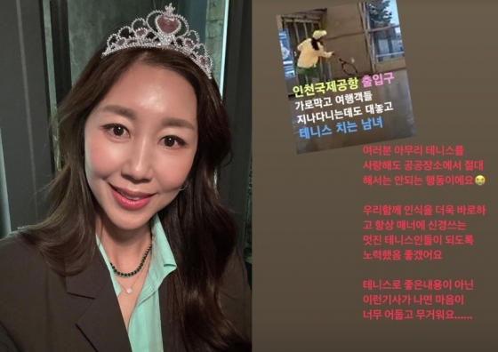 전미라는 14일 '인천국제공항 출입구 가로막고 여행객들 지나다니는데도 대놓고 테니스 치는 남녀'라는 기사를 공유하고 "항상 매너에 신경 쓰는 멋진 테니스인들이 되도록 노력했음 좋겠어요. 좋은 내용이 아닌 이런 기사로 테니스 기사가 나오면 마음이 무거워요"라고 적었다.