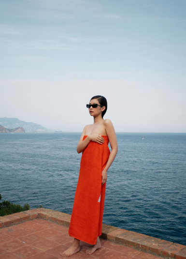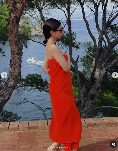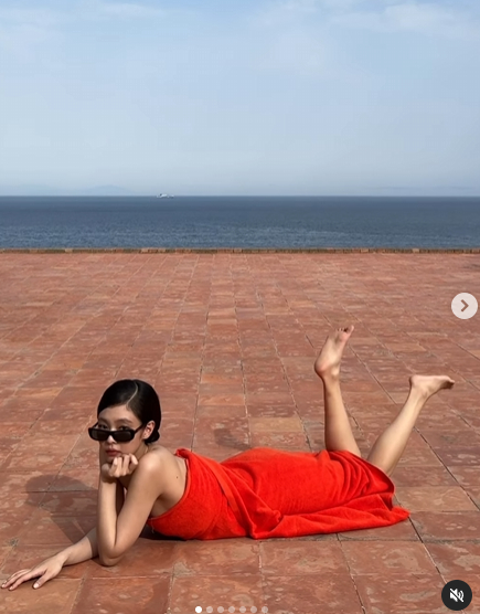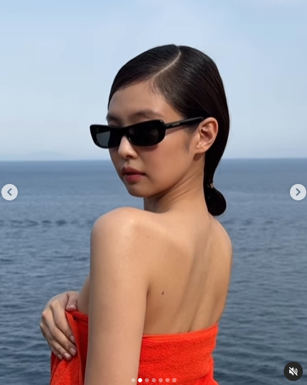 사진과 영상에서 제니는 주황색 롱 타월 하나만 몸을 걸치고 바다를 배경으로 여러 포즈를 취하고 있다.