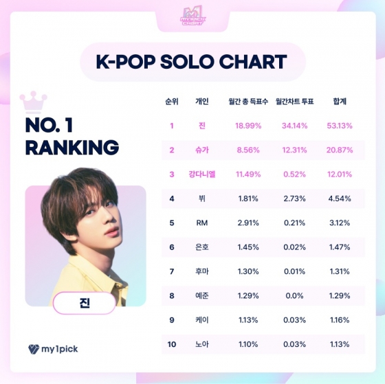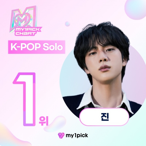 방탄소년단(BTS) 진이 마이원픽(MY1PICK) 월간차트 1위에 오르며 글로벌 인기를 빛냈다.