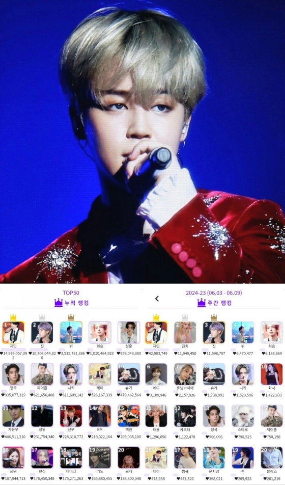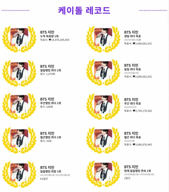 지민은 6월 9일 마감한 K팝 아이돌 인기 투표 서비스 앱 케이돌(KDOL) 주간랭킹(6월 3일~ 6월 9일)에서 4298만 3749개의 하트를 받아 1위를 차지하며 164회째 주간랭킹 1위를 기록하였다.