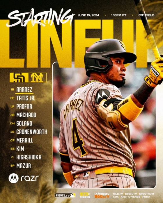 샌디에이고는 아라에즈(1루수)-페르난도 타티스 주니어(우익수)-주릭슨 프로파(좌익수)-맷 마차도(3루수)-도노반 솔라노(지명타자)-제이크 크로넨워스(2루수)-잭슨 메릴(중견수)-김하성(유격수)-카일 히가시오카(포수)로 타선을 꾸렸다. 선발 투수는 애덤 마주르.