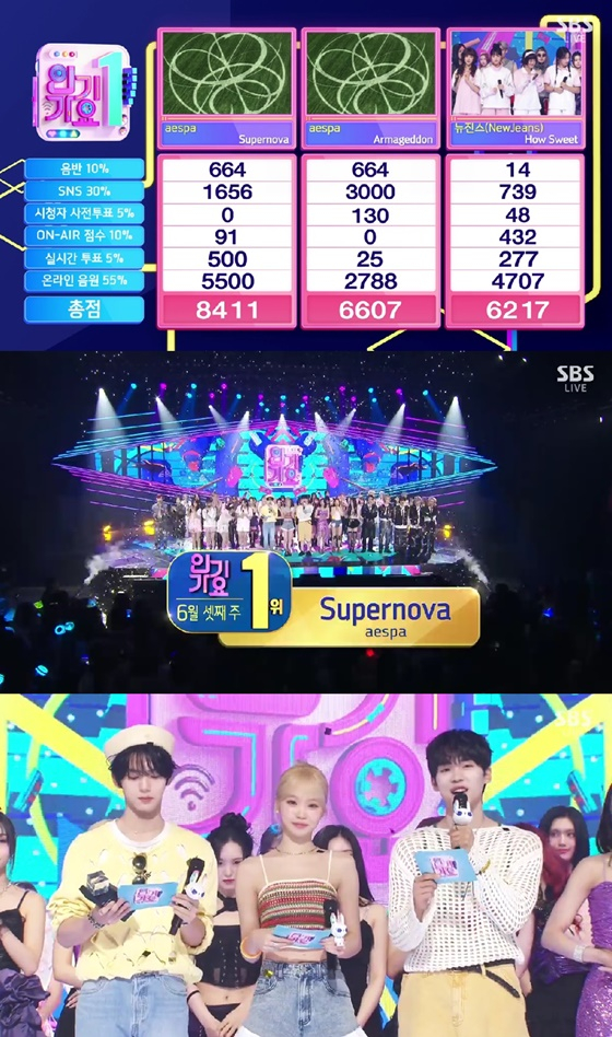 이날 1위 후보에는 에스파 '슈퍼노바(Supernova)', '아마겟돈(Armageddon)', 뉴진스 '버블 검(Bubble Gum)'이 이름을 올린 가운데 에스파 '슈퍼노바'가 1위에 올랐다.