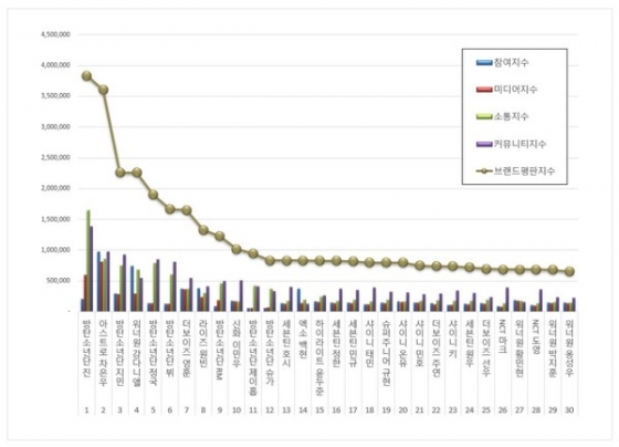 2024년 6월 보이그룹 개인 브랜드평판 30위 순위는 방탄소년단 진, 아스트로 차은우, 방탄소년단 지민, 워너원 강다니엘, 방탄소년단 정국, 방탄소년단 뷔, 더보이즈 영훈, 라이즈 원빈, 방탄소년단 RM, 신화 이민우, 방탄소년단 제이홉, 방탄소년단 슈가, 세븐틴 호시, 엑소 백현, 하이라이트 윤두준, 세븐틴 정한, 세븐틴 민규, 샤이니 태민, 슈퍼주니어 규현, 샤이니 온유, 샤이니 민호, 더보이즈 주연, 샤이니 키, 세븐틴 원우, 더보이즈 선우, NCT 마크, 워너원 황민현, NCT 도영, 워너원 박지훈, 워너원 옹성우 순으로 분석됐다.