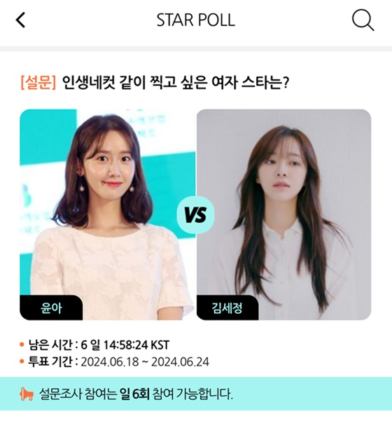 모바일 아티스트 종합 콘텐츠 앱 스타폴(STARPOLL)은 18일부터 오는 24일까지 '인생네컷 같이 찍고 싶은 여자 스타는?'이라는 주제로 설문 조사를 진행한다.