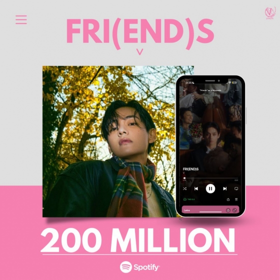 방탄소년단(BTS) 뷔의 '프렌즈'(FRI(END)S)가 스포티파이에서 2억 스트리밍을 돌파하며 인기를 빛냈다.