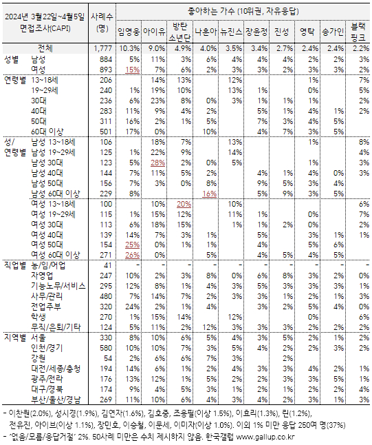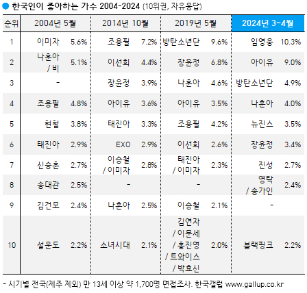 임영웅은 한국갤럽이 2024년 3월 22일부터 4월 5일까지 전국(제주 제외) 만 13세 이상 1777명에게 가장 좋아하는 가수를 물은 결과(자유응답), 10.3%로 1위를 차지했다.