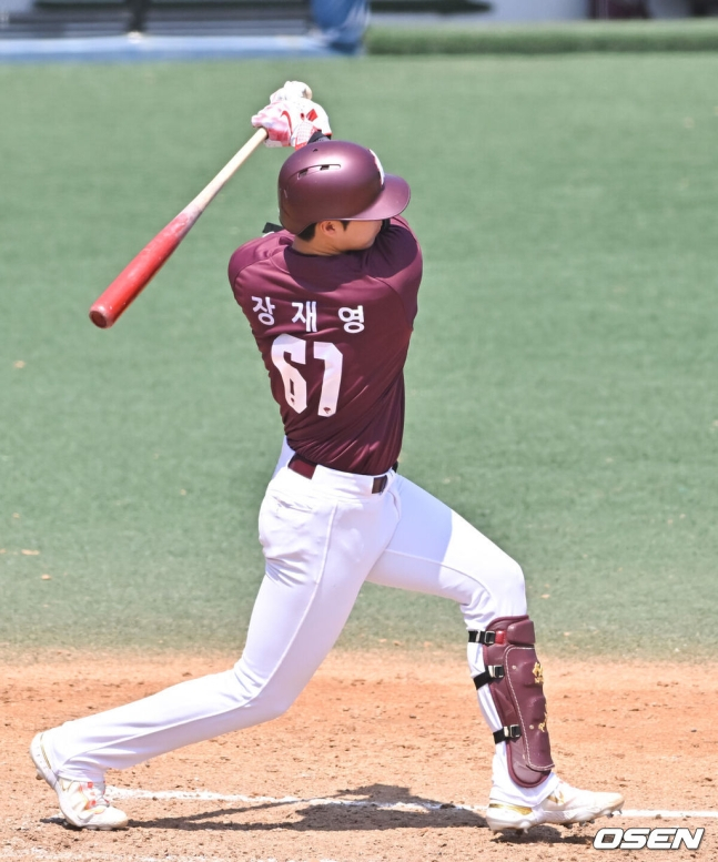 이날도 장타력은 여전했다. 고양이 1-0으로 앞선 1회 초 1사에서 장재영은 신헌민의 공 4개를 지켜본 뒤 우측 담장을 넘어가는 아치를 그렸다. 비거리 115m의 시즌 5호 포.