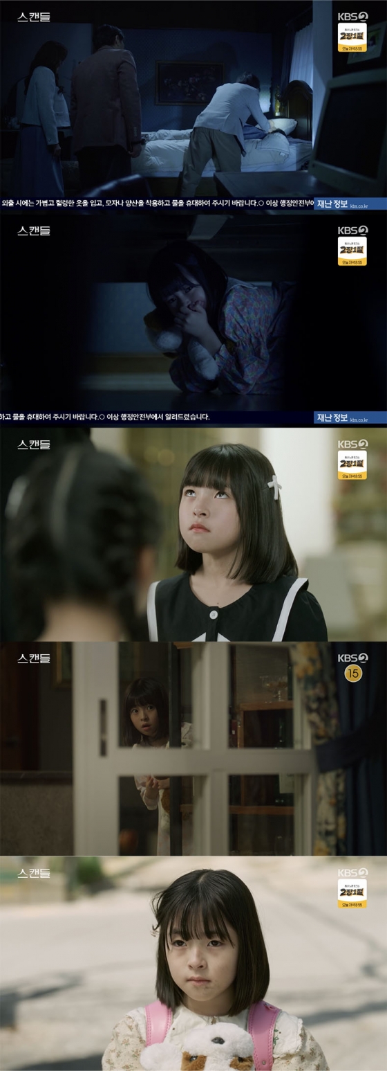 18일 방송된 KBS 2TV 일일드라마 '스캔들' 3회에서는 문경숙(한채영 분)이 민태창(이병준 분)과 공모해 백동호(최령 분)를 살해한 장면을 딸 백설아(조은솔 분)이 목격한 장면이 그려졌다.
