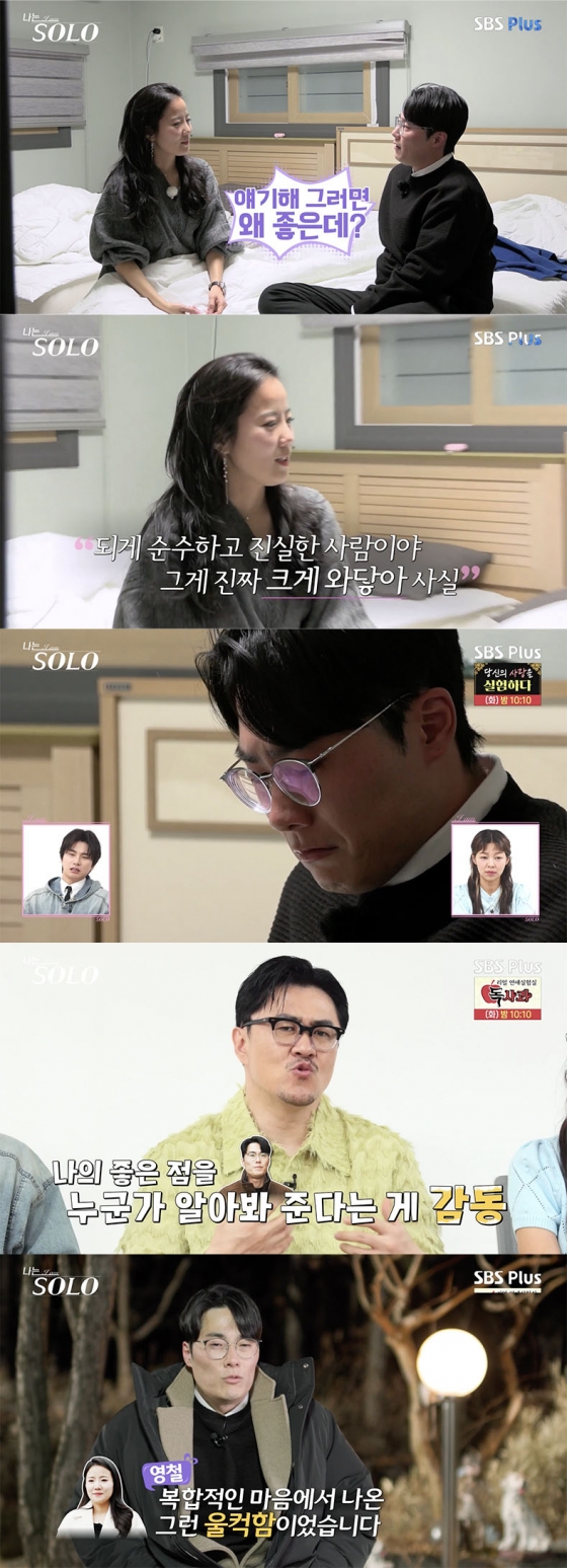 영철 역시 눈물을 흘렸다. 최종 선택을 앞두고 영철과 영숙은 장거리 연애를 앞두고 진지한 대화를 나눴다. 영철은 영숙에게 자신의 좋은 점을 딱 짚어서 얘기해달라고 요청했다. 이에 영숙은 "되게 순수하고 진실한 사람이다. 그게 크게 와닿는다"라고 했다. 이를 들은 영철은 말이 끝나자마자 눈물을 보였다.