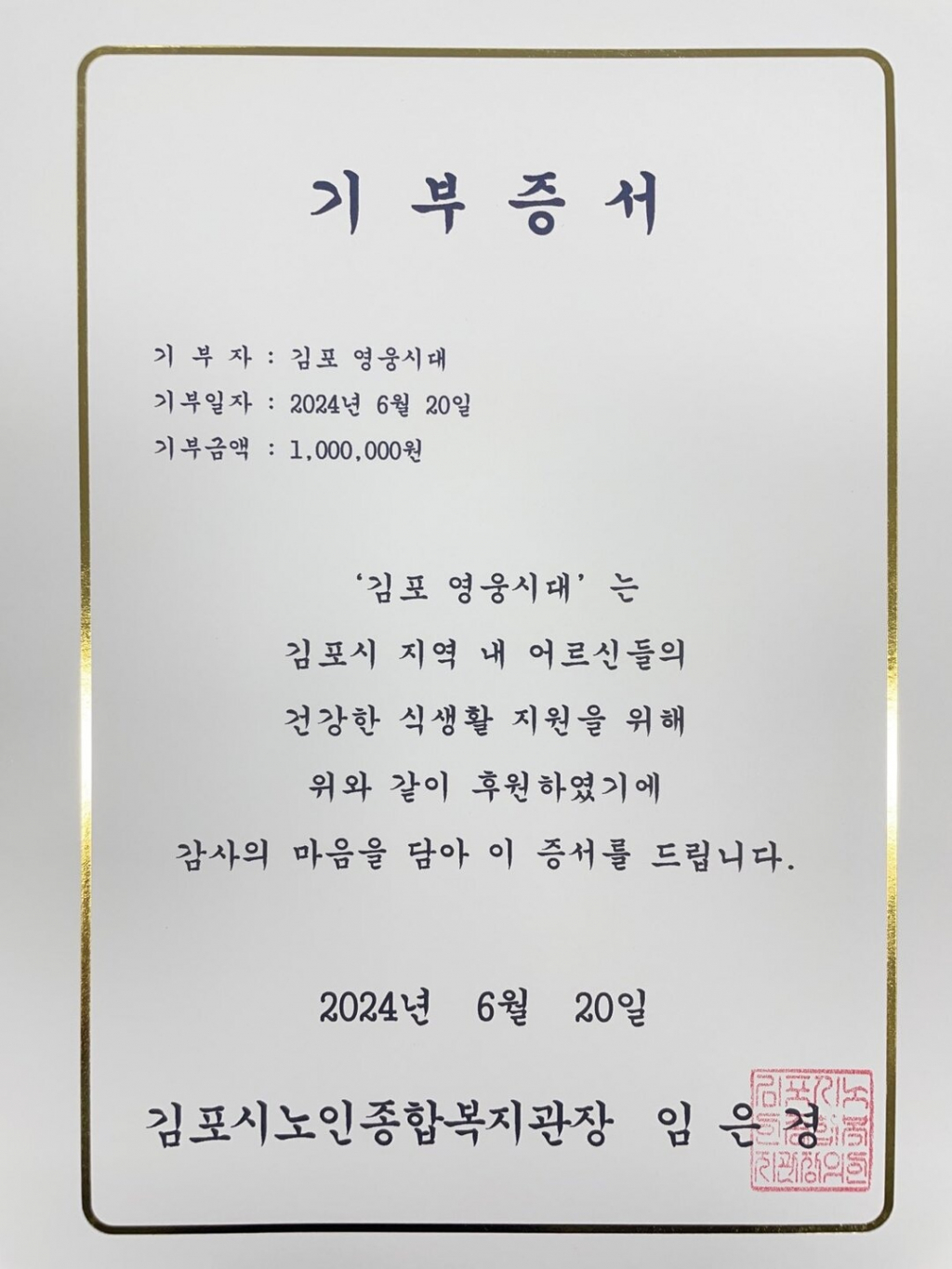 '김포영웅시대'는 "김포시노인복지회관은 저소득층 노인분들께는 급식을 무료로 제공하고 있다"며 "이번 기부를 통해 저소득 노인분들께 균형 있는 식단이 제공되기를 바란다"고 했다.