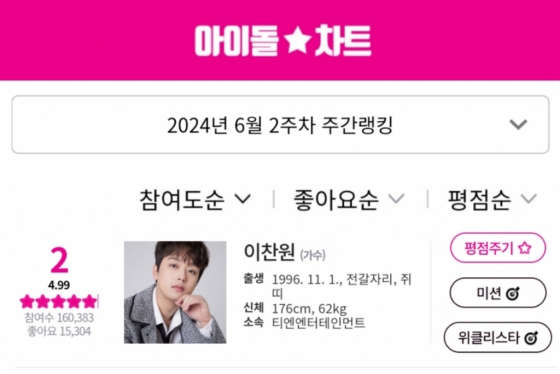 이찬원은 6월 2주 차 아이돌차트 평점랭킹에서 16만 383표를 획득, 전체 2위를 차지했다.