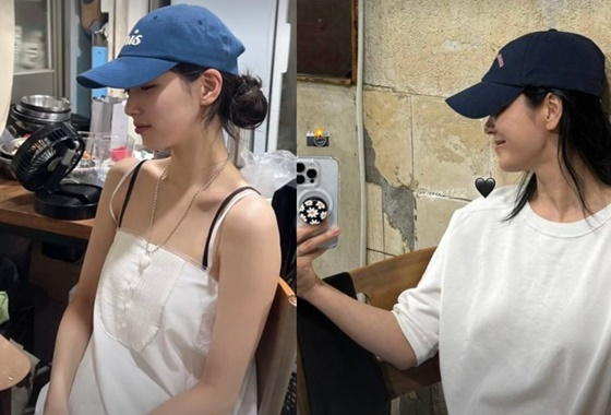 공개된 사진 속 수지는 하얀색 민소매 블라우스에 파란색 모자를 매치했다. 날렵한 턱선의 옆태를 자랑하며 눈길을 사로잡았다.
