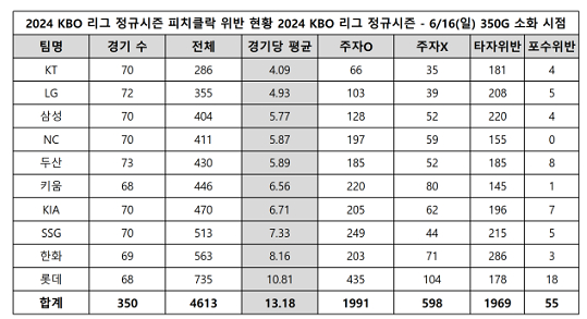 현재는 피치클락이 시행되고 있지만 위반했을 때에도 특별한 제재는 없다. 그렇기에 위반 사례는 한 경기에서도 수 차례 나온다. 이를 중시하는 팀과 아닌 팀의 간극도 크다. 가장 철저히 지키고 있는 KT는 70경기에서 286회, 경기당 4.09회가 나왔다. 반면 롯데는 68경기 735회, 경기당 10.81회로 2배 이상 더 많은 피치클락 위반을 범했다. 경기당 평균은 무려 13.18회다.