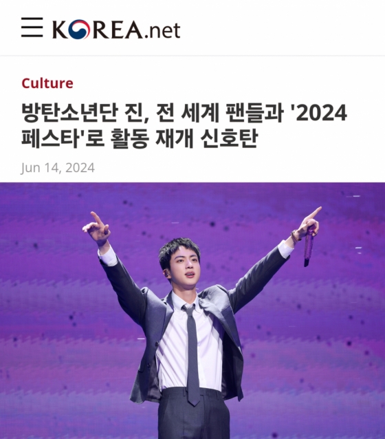 6월 14일 대한민국 공식 웹사이트인 코리아 넷(Korea. net)은 '방탄소년단 진, 전 세계 팬들과 2024 페스타로 활동 재개 신호탄'이라는 제목의 기사를 게재했다.