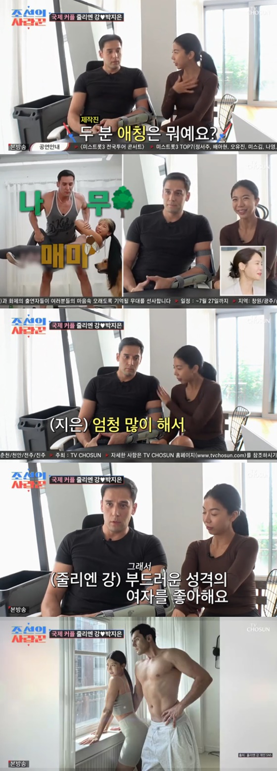 24일 방송된 TV조선 예능 프로그램 '조선의 사랑꾼'에서는 모델 겸 배우 줄리엔강, 운동 크리에이터 박지은(제이제이)이 새로운 부부로 합류했다.