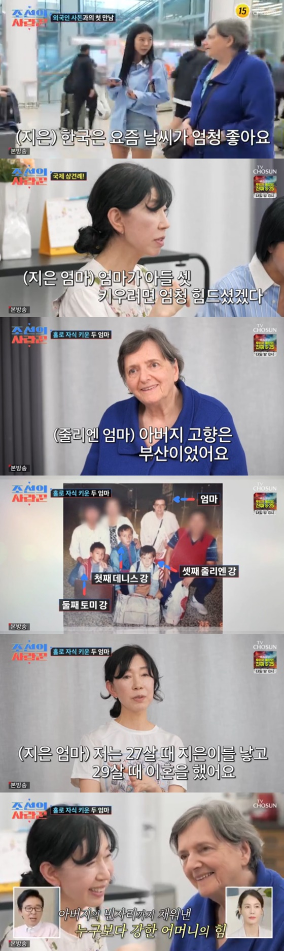 줄리엔강 어머니는 줄리엔강, 박지은, 박지은 어머니와 한자리에 모여 시간을 보냈다. 박지은 어머니는 줄리엔강 어머니에게 "어머니가 아들 셋을 키우시려면 엄청 힘드셨겠다"고 말했다.