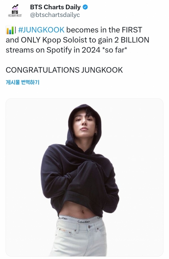 방탄소년단(BTS) 정국이 '스포티파이'(Spotify)에서 2024년 K-팝 솔로 가수 최초로 20억 스트리밍을 기록하며 인기를 빛냈다.
