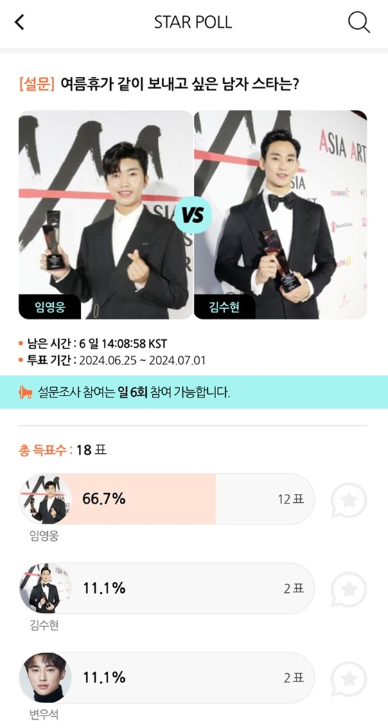 모바일 아티스트 종합 콘텐츠 앱 스타폴(STARPOLL)은 25일부터 오는 7월 1일까지 '여름휴가 같이 보내고 싶은 남자 스타는?'이라는 주제로 설문 조사를 진행한다.