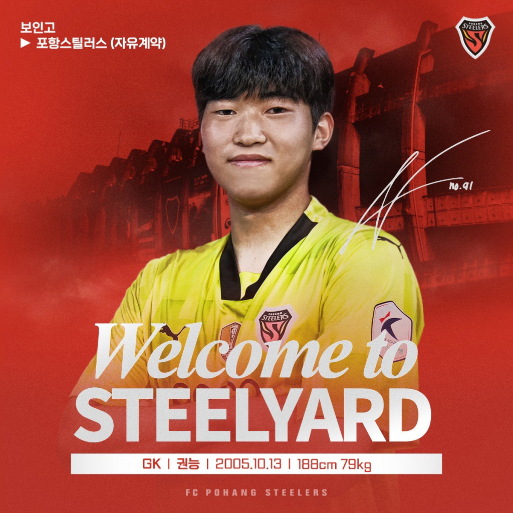 포항 스틸러스가 신인 골키퍼 권능을 영입해 골문을 강화했다.