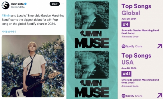 방탄소년단 지민 '스메랄도 가든 마칭 밴드', 2024 K팝 스포티파이 최다 스트리밍 데뷔..'글로벌 음원킹'