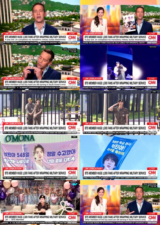 미국 CNN은 '진과 보낸 하루' 뉴스를 전했다. 진은 전역 바로 다음 날이자 방탄소년단 페스타(FESTA) 마지막 날인 지난 6월 13일, 서울 잠실실내체육관에서 '2024년 6월 13일의 석진, 날씨 맑음' 팬 미팅을 가졌다.