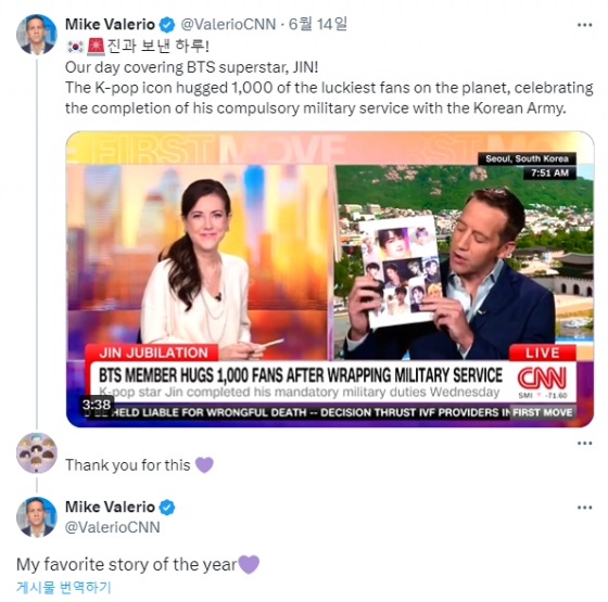 CNN 기자 마이크 발레리오(Mike Valerio)는 "이런 해외 행사에 참가할 때 최고봉은 아무래도 서울 종합운동장 그늘에서 입장을 기다리면서 했던 굿즈 교환이었습니다. 이건 플로리다 올랜도에서 온 진 팬이 주고 간 최고 핸섬 클로즈업 포토 카드고요. 태국에서 온 팬은 진이 탄생시킨 캐릭터로 특제 수제 쿠키를 구워오기도 했습니다", "줄리아(CNN 앵커), 진짜 대단했어요. 진짜 놀라운 시간을 보냈는데요, 더 놀라운 건 이건 아까 몇시간 전에 있었던 일에 비하면 그냥 '맛보기'에 가깝다고 할까요?"라고 말했다. 기자는 수천 명이 서울에 운집했다며 세계 곳곳에서 온 팬들과 인터뷰를 가지고, 전역하는 진의 모습과 위버스 라이브에서 밝힌 '1년 6개월 동안 너무 즐거웠고 너무 좋은 사람들을 만나서 다행이었다'는 진의 전역 소감 등을 전했다.