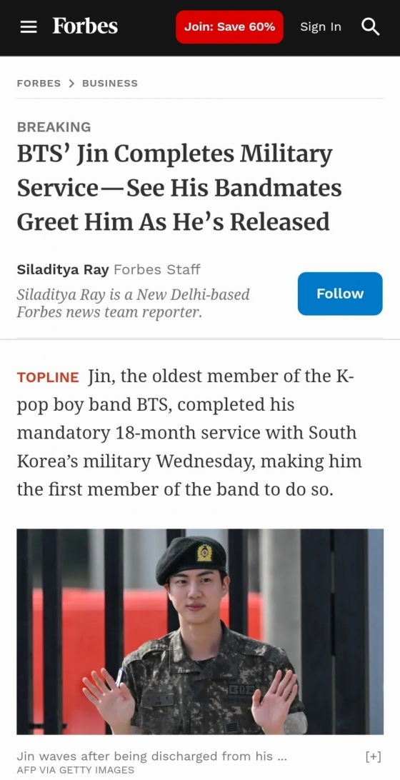 포브스(Forbes)는 "군 복무를 마치고 전역하는 BTS 진과 그를 맞이하는 동료 멤버들"이라는 제목의 기사를 통해 진의 전역 소식을 전했다.