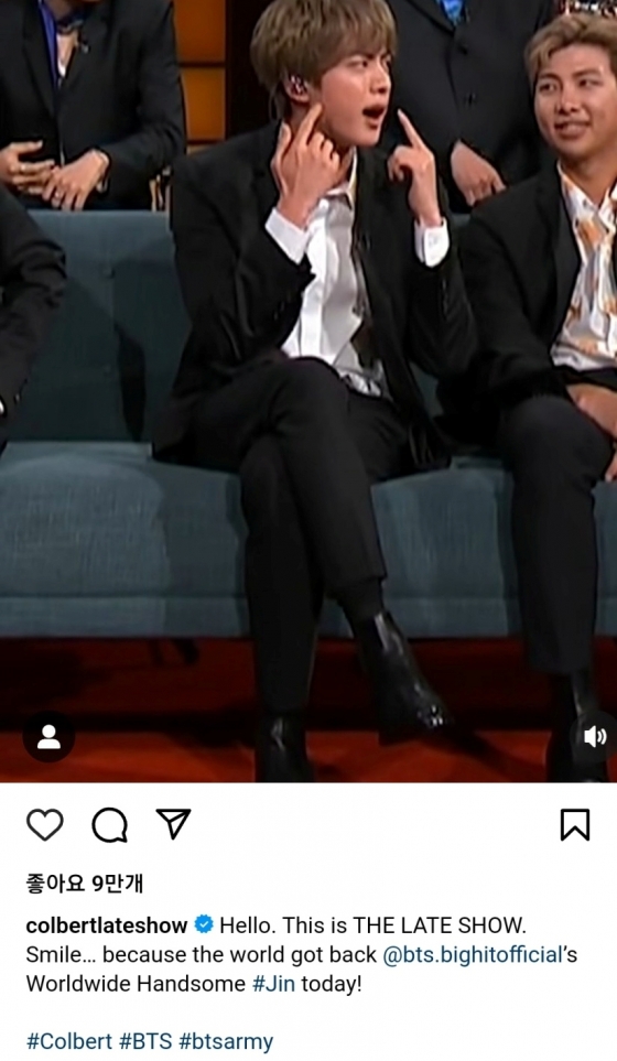 미국 CBS 방송국의 인기 토크쇼 '레이트 쇼 위드 스티븐 콜베어'(The Late show with Stephen Cobert)는 공식 인스타그램을 통해 방탄소년단이 출연한 방송에서 진이 말하는 장면 영상과 함께 "웃으세요... 오늘 전 세계가 월드와이드핸섬을 되찾았으니까요"라는 글을 게재하며 진의 전역을 뜨겁게 축하했다.