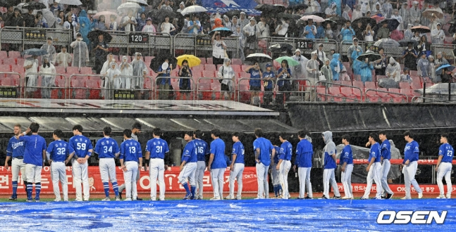 삼성은 전날 같은 장소에서 열린 KT 위즈와 경기에서 4회초까지 7-1 리드를 잡았다. 이어진 4회말 공격. KT는 1사 후 배정대가 우전 안타로 출루했다. 다음 타자 황재균이 타석에 들어서기 전 비가 쏟아지면서 경기가 중단됐다.