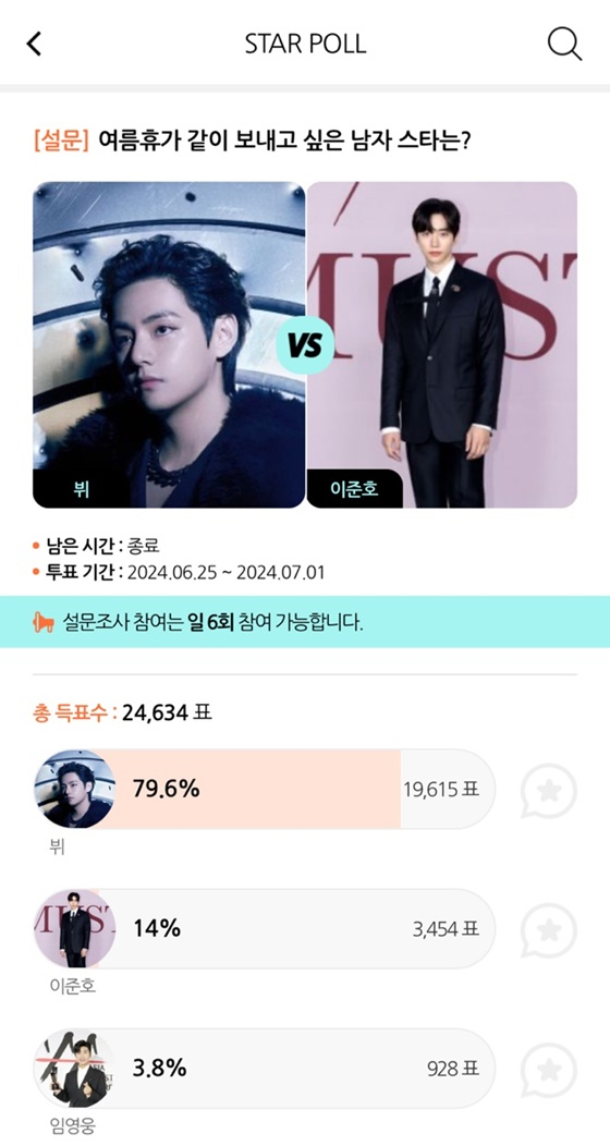 뷔는 지난 6월 25일부터 7월 1일까지 종합 엔터테인먼트 모바일 앱 스타폴(STARPOLL)에서 진행된 '여름휴가 같이 보내고 싶은 남자 스타는?' 설문에서 1위에 이름을 올렸다.