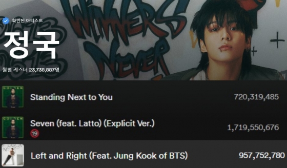 정국은 스포티파이에서 'Standing Next to You'를 비롯해 솔로 싱글 'Seven'(세븐)과 협업곡 'Left and Right'(레프트 앤드 라이트)까지 7억 이상 스트리밍 곡 통산 3개를 달성했다.