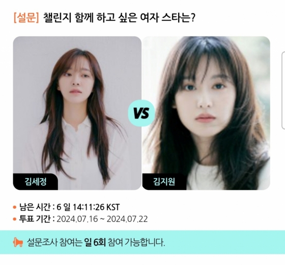 모바일 아티스트 종합 콘텐츠 앱 스타폴(STARPOLL)은 16일부터 23일까지 '챌린지 함께 하고 싶은 여자 스타는?'이라는 주제로 설문 조사를 진행한다.