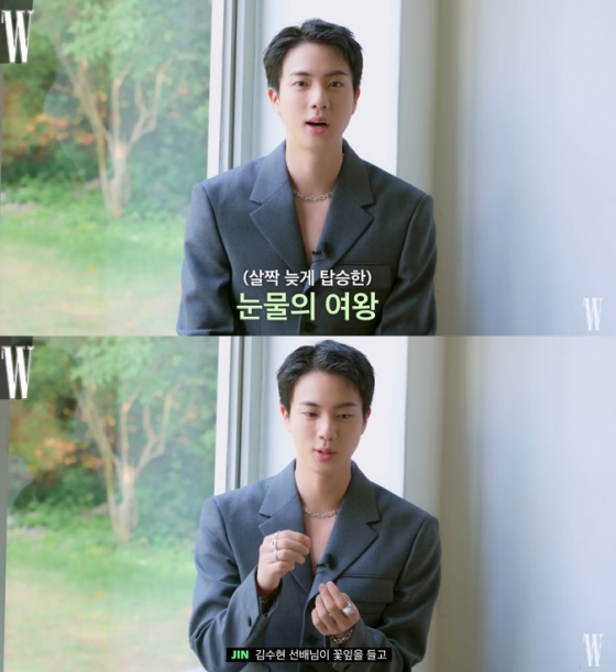 진은 또 자신이 빠졌던 작품을 묻는 질문에 "최근 가장 재미있게 본 드라마는 '눈물의 여왕'이다. 그 중에서도 김수현 선배님이 꽃잎을 들고 '좋아한다, 안 한다'라고 말하는 장면을 보고 너무 멋있다고 생각했다"고 말했다.