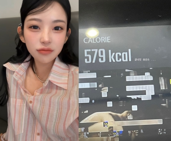 사진에는 최준희가 소화한 총 칼로리 수치인 579kcal가 찍혀 있다. 최준희는 "굿나잇 유산소"라고 문구도 덧붙였다.